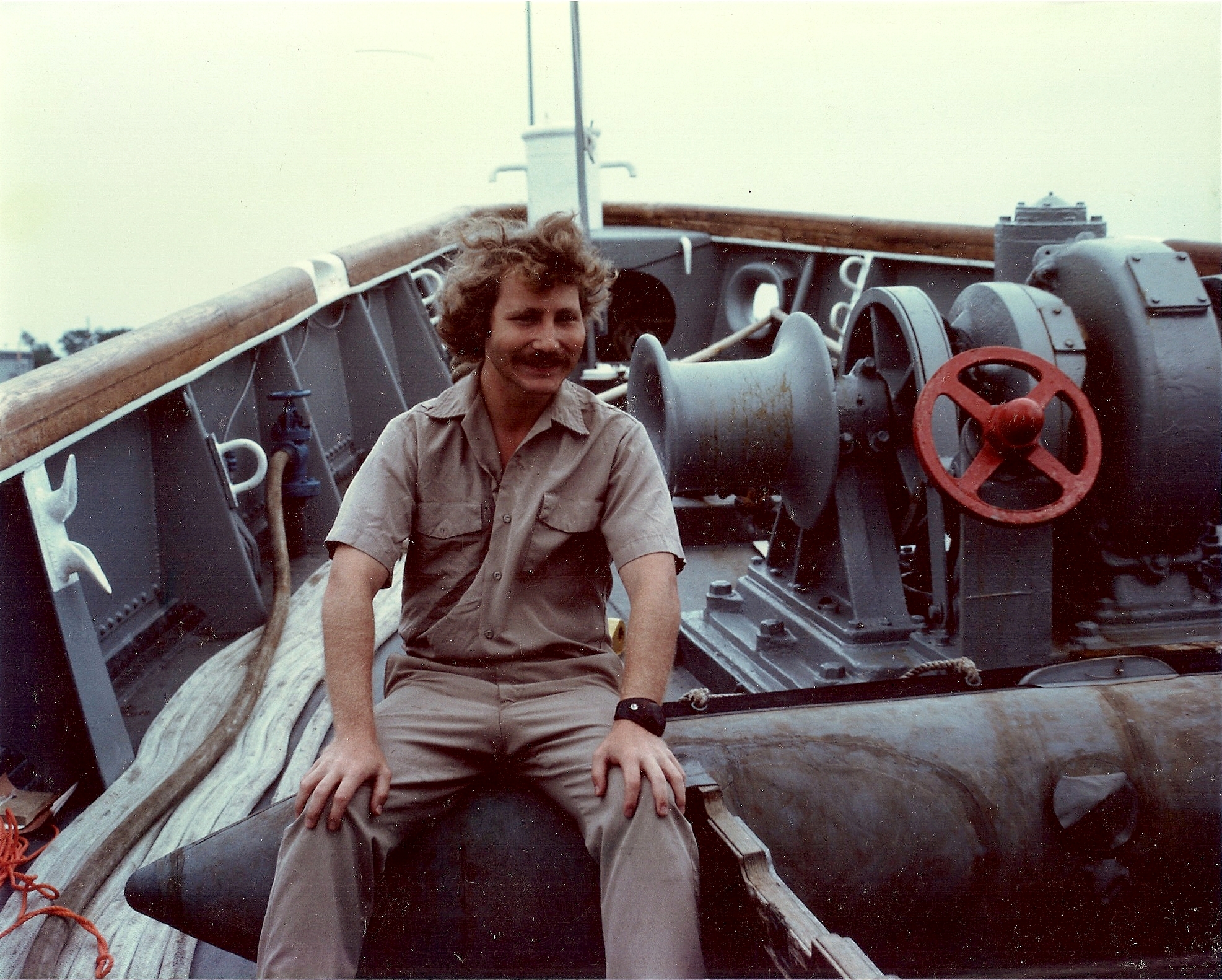 One is a photo that I took of the USNS Atakapa at Little Creek when I was on her in 1979, probably about a year before she was finally retired. The other is a photo of myself on the fordeck of the Atakapa during that time, when I was the Second Mate of her. That's the anchor windlass behind me, and the fire hose hooked up to the blue hydrant is the connection to the shoreside fresh water supply. The mooring line on the deck is "faked out", Merchant Marine-fashion, rather "flemished down" Navy-Style because, while less ornate, it was easier to do, easier to secure for sea and instantly ready to run out at any time. The object I was sitting on was our infaltable "Z-Boat", which we used at sea lieu of the motor whaleboat, because it was much easier for a small crew to launch and recover. As you can see, we didn't go in much for uniforms. The sort of crews we got weren't the sort of men likely to be impressed by gold braid and fruit salad. Besides, the entire ships's company was so small that everybody knew who everybody else was, anyway.